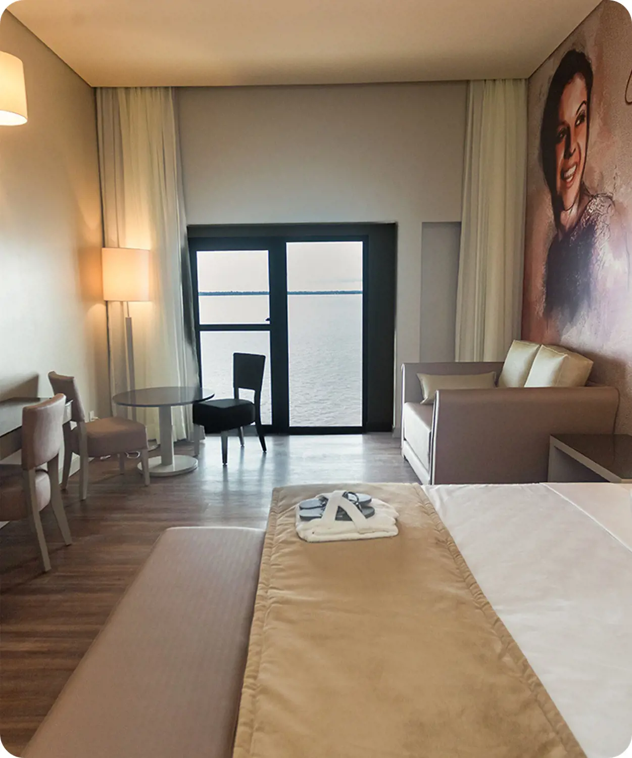 A categoria mais sofisticada do hotel. Ampla, elegante e com vista deslumbrante, a Suíte Premium combina luxo, privacidade e serviços exclusivos — o espaço ideal para celebrar momentos especiais na Amazônia.