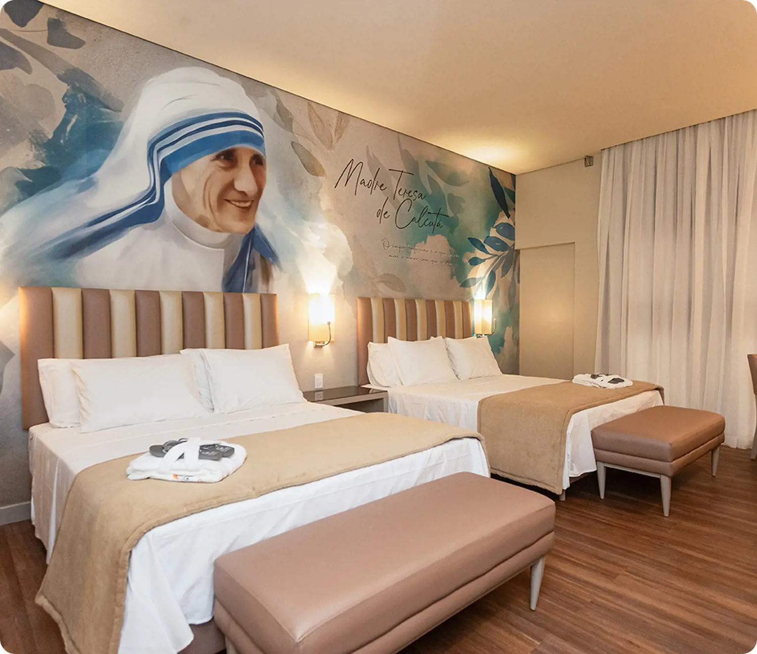 Projetado para receber todos com conforto, o Apartamento Familiar oferece camas extras, espaço generoso e comodidades que tornam a experiência em família ainda mais acolhedora.