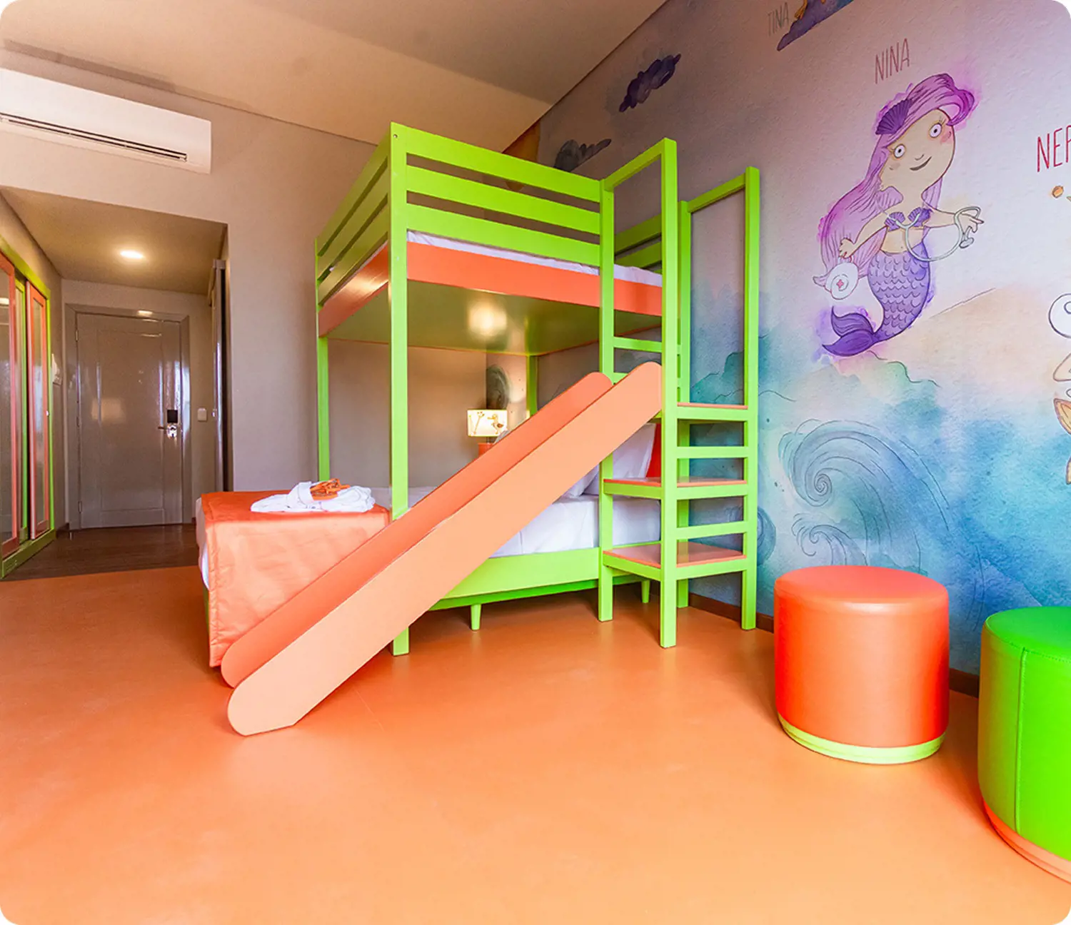Acomodações Temáticas NEP: Quartos decorados especialmente para as crianças, com camas em formato de barco, cores vibrantes e itens lúdicos.