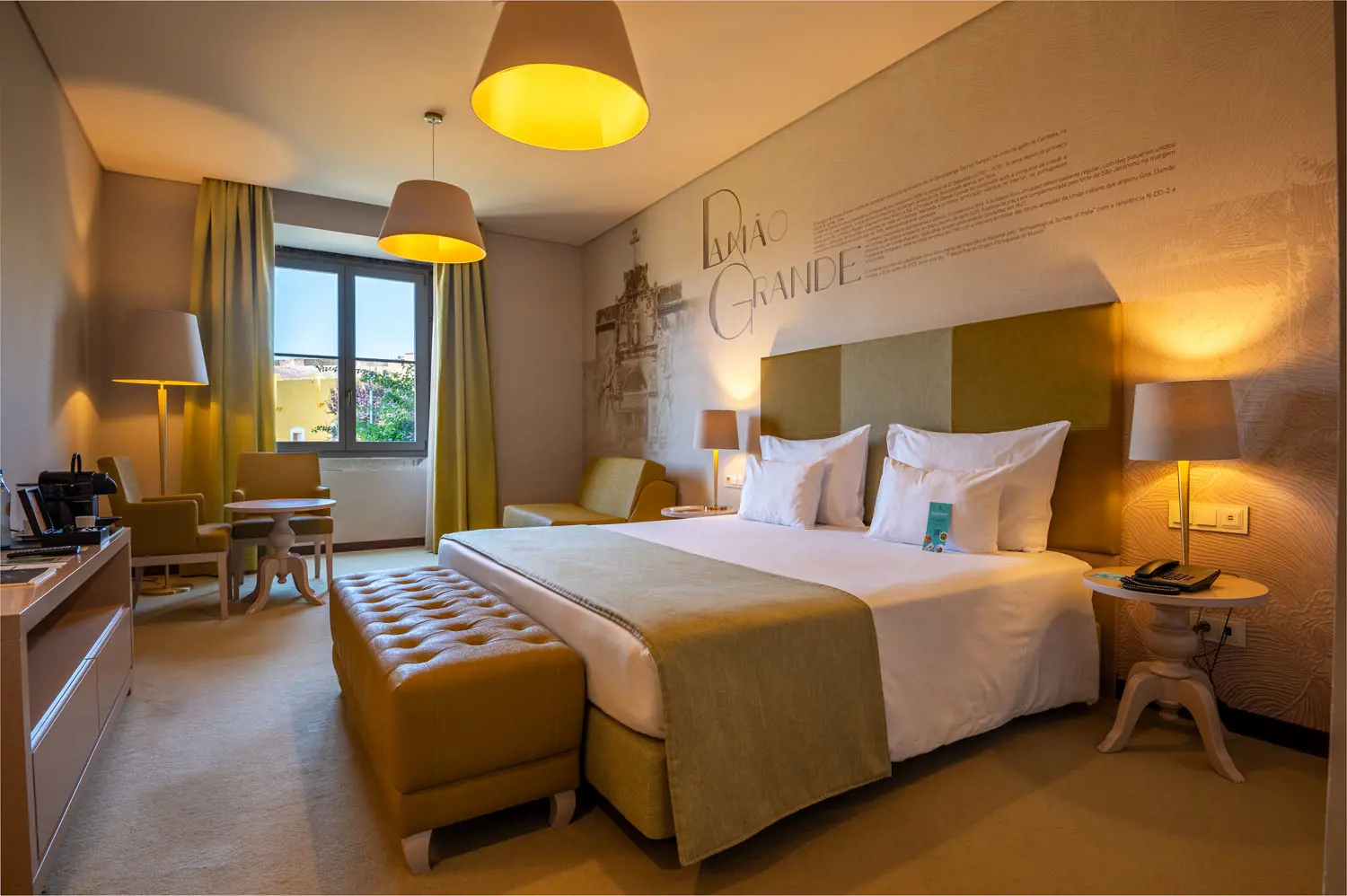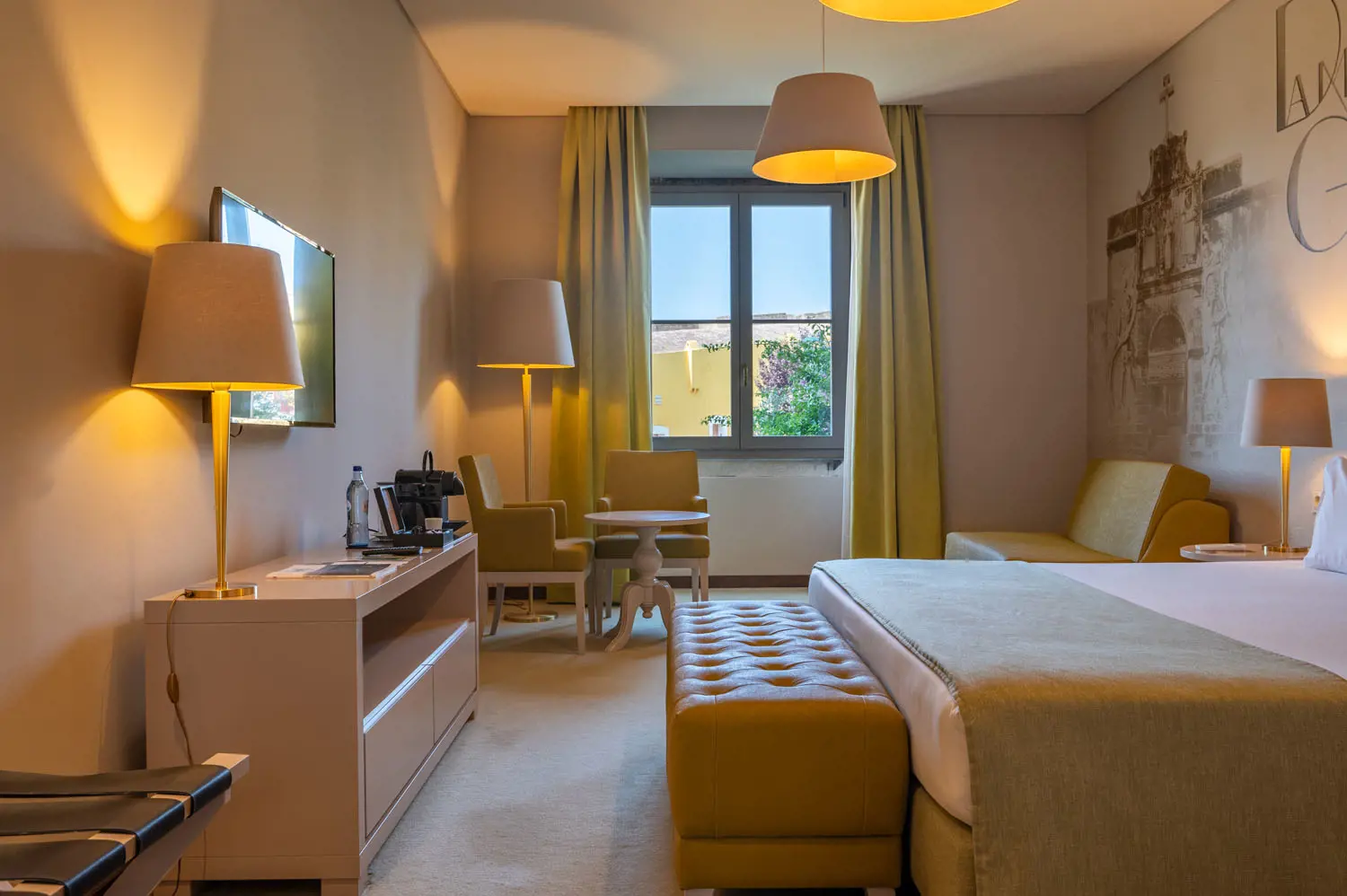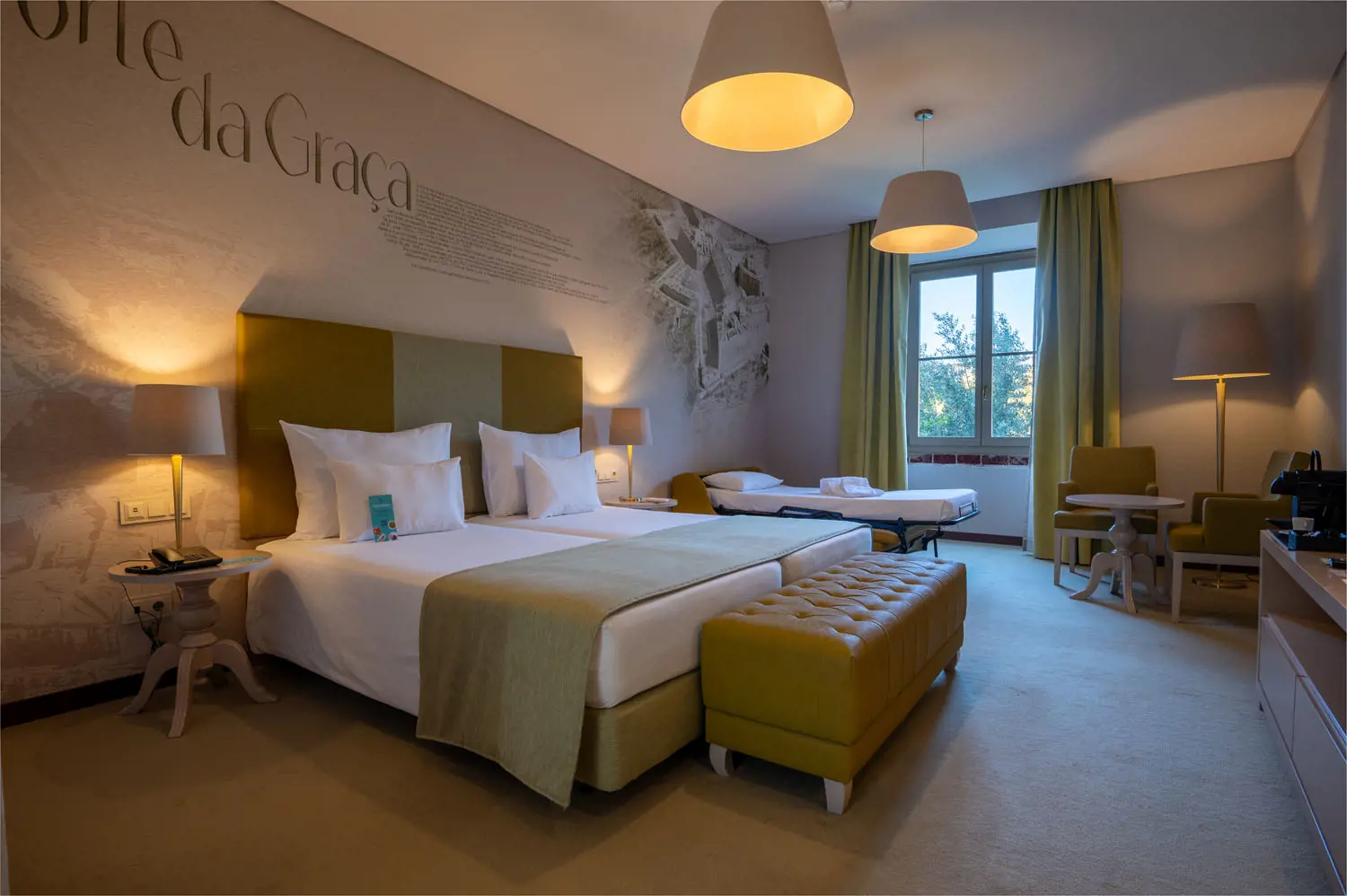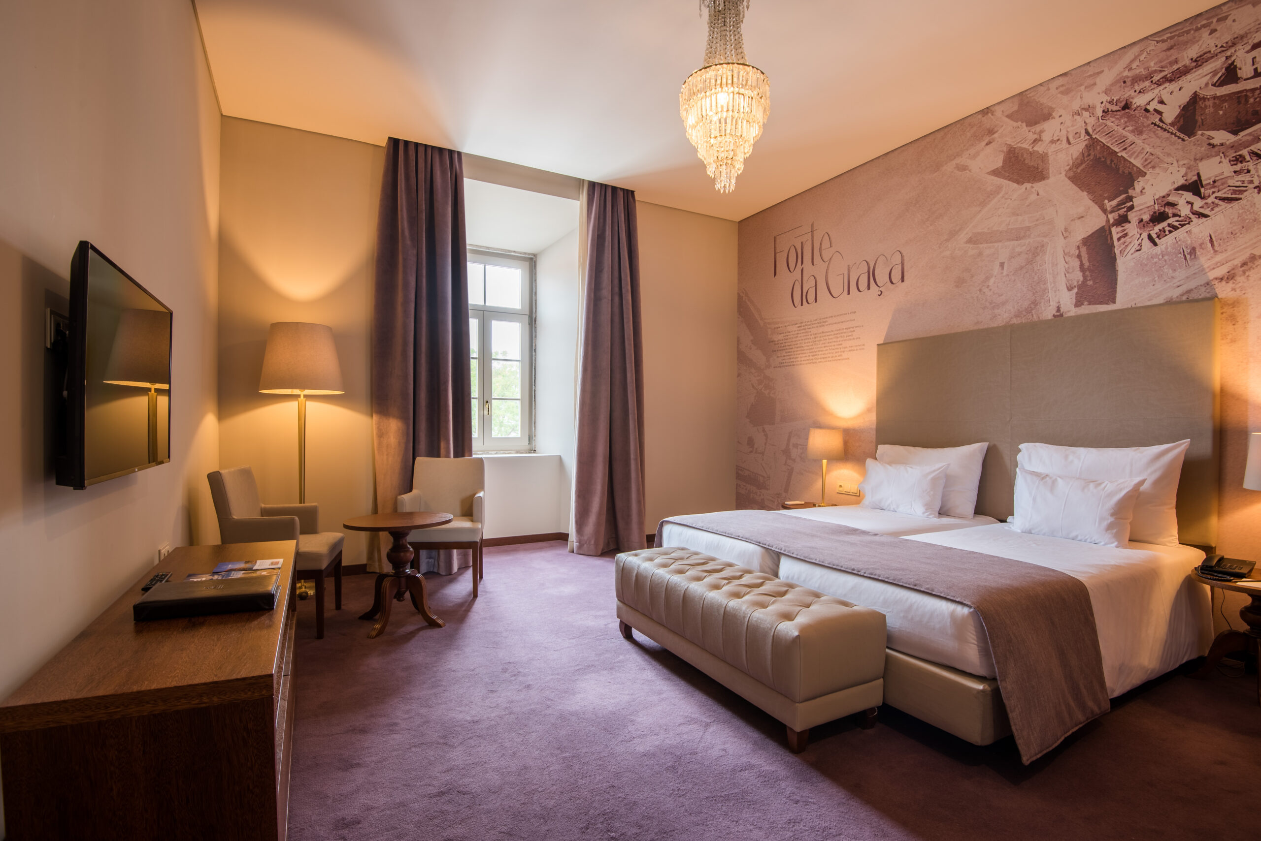 As acomodações estão distribuídas por 79 quartos, apresentando tipologias variadas que vão desde quartos standard até suítes mais amplas, cada uma composta por mobiliário refinado, climatização, TV de ecrã plano, cofre, minibar e casa de banho privativa. Alguns quartos contemplam zonas de estar separadas ou vistas panorâmicas sobre a cidade‑fortaleza, garantindo diferentes níveis de conforto e privacidade.