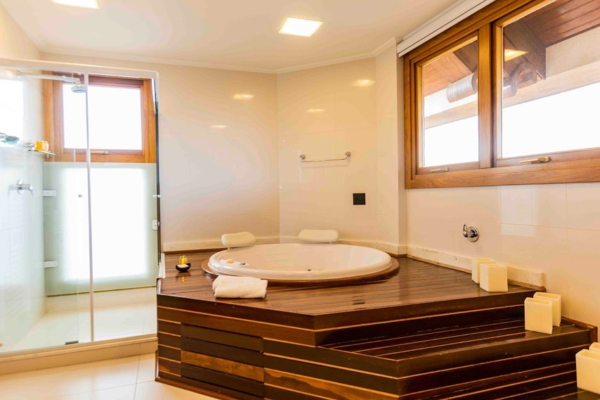 Localizadas no andar superior, com acesso por escadas, essas suítes se destacam pela arquitetura diferenciada, inspirada no charme das montanhas. Com 91m², oferecem um ambiente amplo e aconchegante, incluindo uma antessala e uma janela panorâmica que revela uma vista deslumbrante da natureza ao redor. O espaçoso banheiro conta com uma elegante banheira de hidromassagem redonda, ideal para momentos de puro relaxamento. É possível preparar o sofá-cama, que acomoda até duas crianças de até 10 anos.