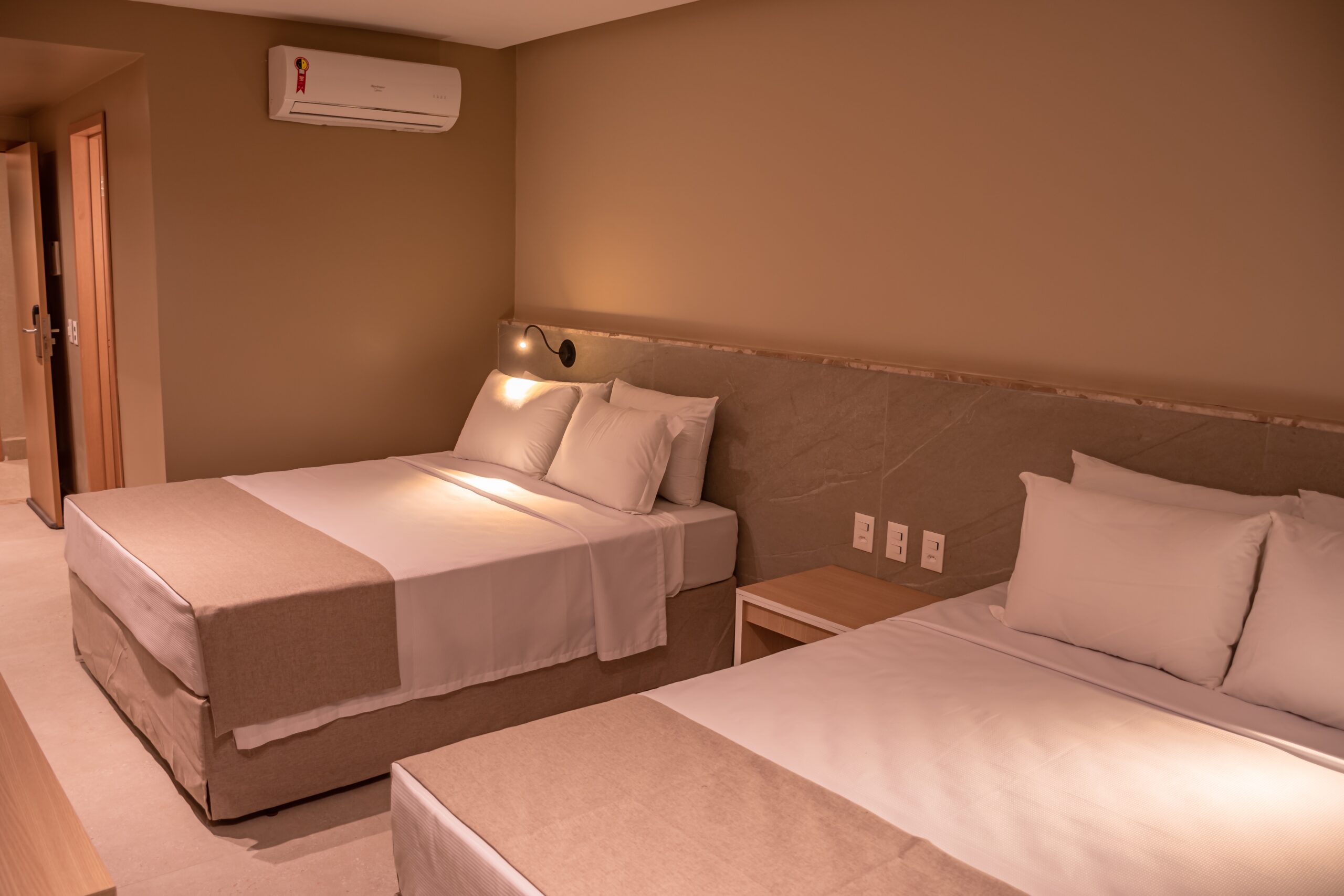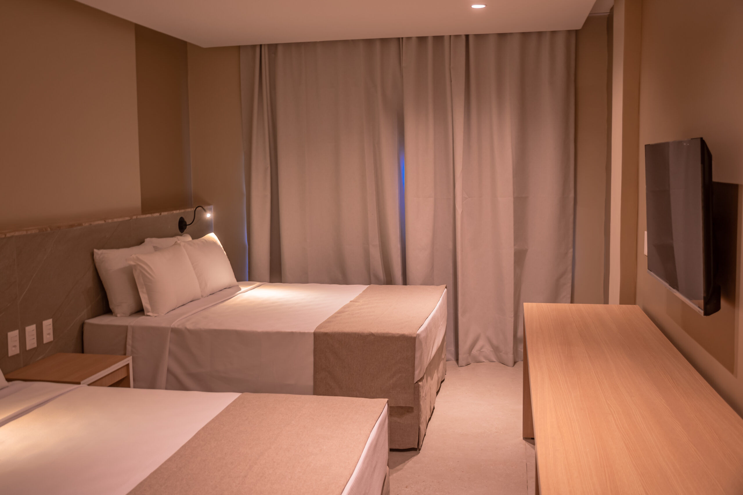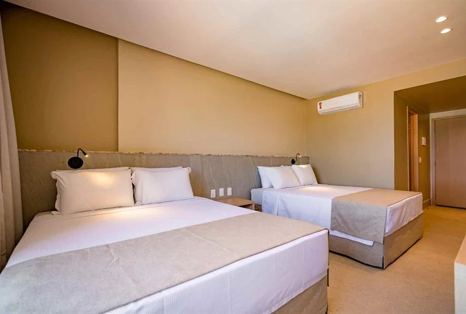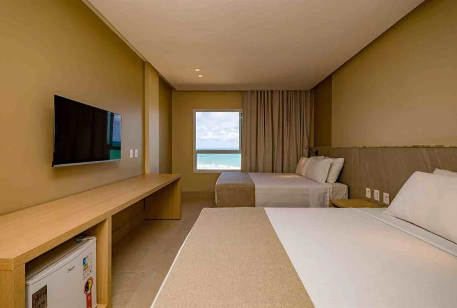Acomodação sem vista mar. Configurada com 1 cama de casal para apartamento duplo. Configurada com 2 camas de casal para apartamento triplo ou quádruplo. Acomoda no máximo 4 pessoas, já incluindo criança.