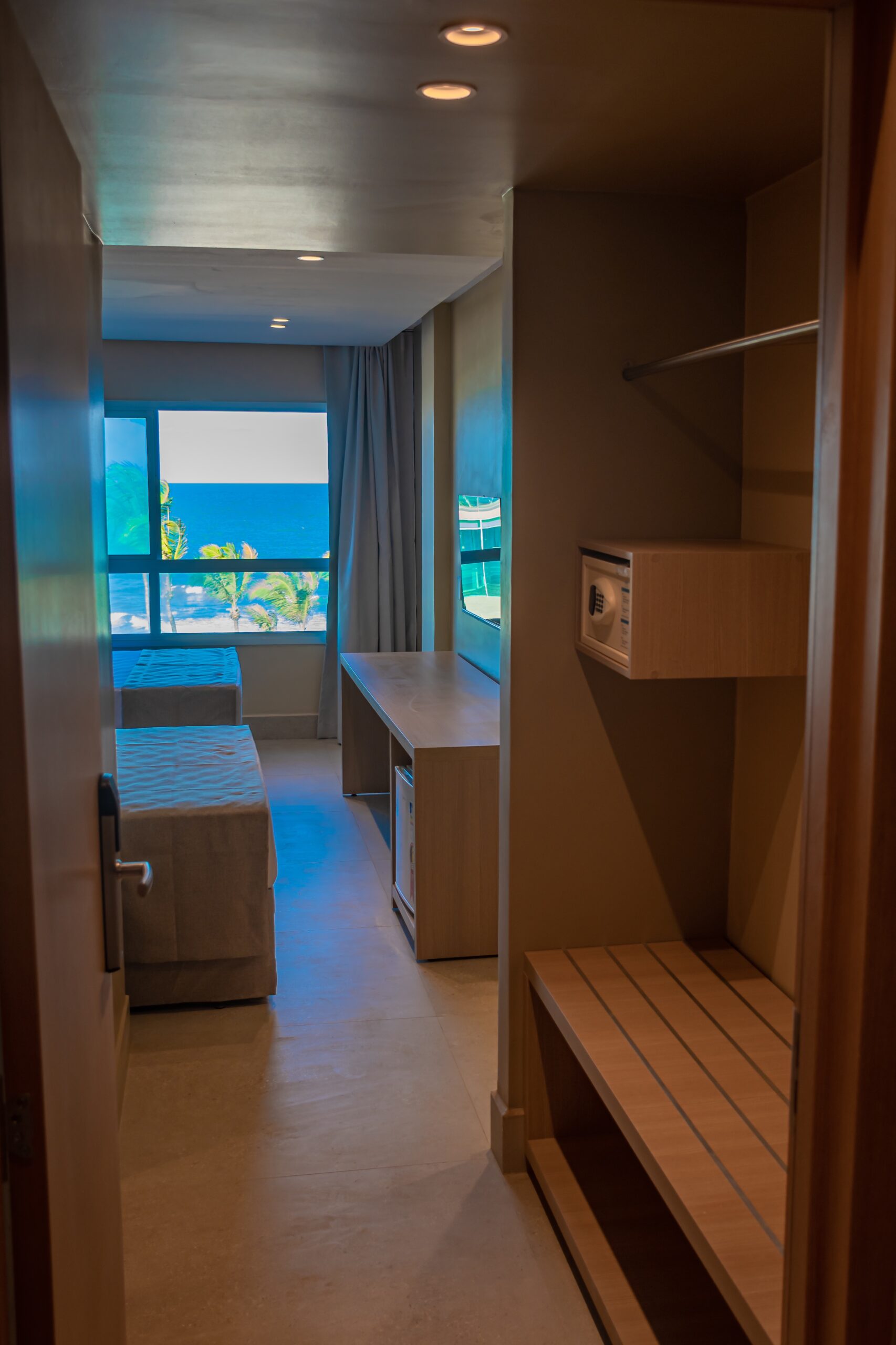 Acomodação família com vista mar. Configurada com 2 camas de casal e 1 sofá-cama individual. Acomoda no máximo 5 pessoas, sendo 3 adultos mais 2 crianças de 0 a 12 anos ou 2 adultos mais 3 crianças de 0 a 12 anos.
