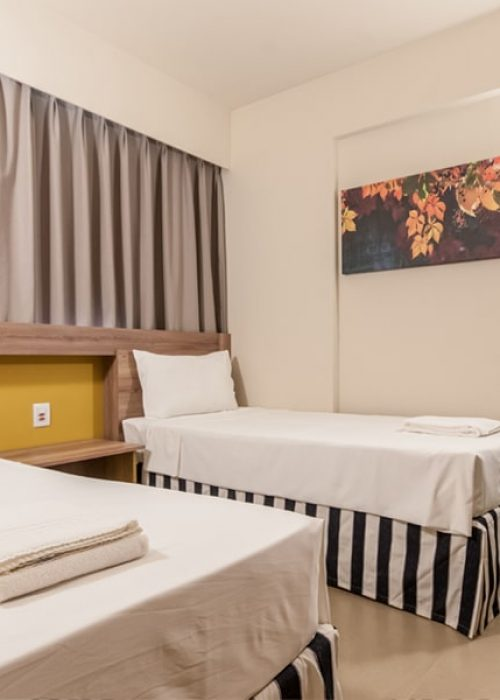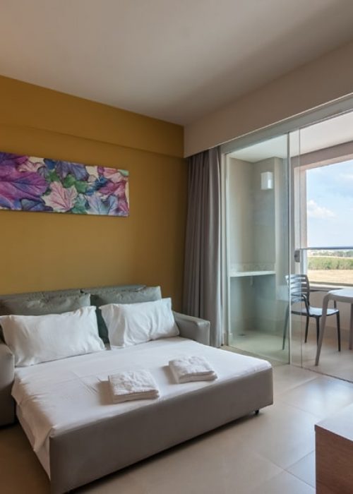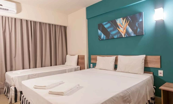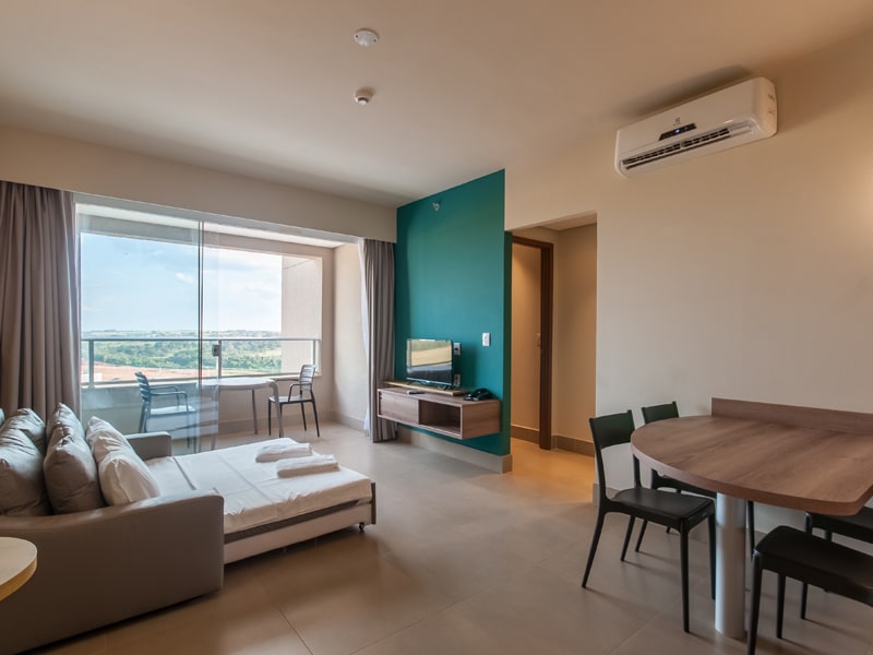 01 quarto com 1 cama de casal e 1 cama de solteiro, sala com 1 sofá cama, cozinha tipo americana e varanda. Suíte Superior localizada no térreo. Acomoda até 5 pessoas.