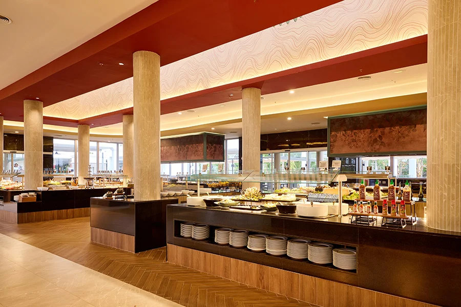 A proposta gastronômica do hotel inclui restaurante principal em estilo buffet com estações de cozinha ao vivo, além de opções à la carte com culinária asiática, italiana, japonesa e mexicana. Há também bar e serviço de bebidas ilimitadas, 24 horas, com acesso a todos os bares do resort e minibar constantemente reabastecido nos quartos. Este conjunto garante que cada refeição seja uma nova descoberta e permita adaptações a diferentes preferências e paladares.