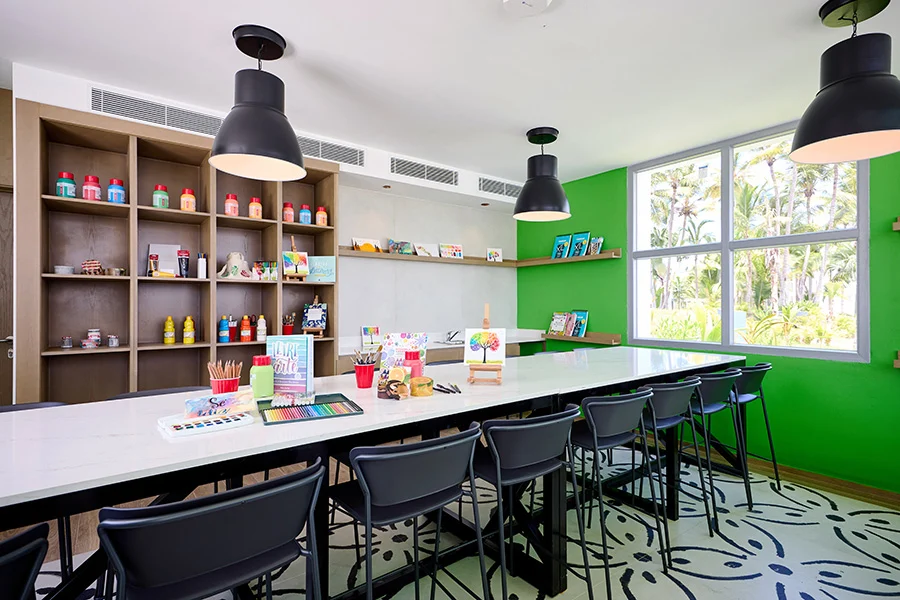 A estrutura voltada para os pequenos inclui o clube infantil RiuLand, com programação dedicada para idades de 4 a 12 anos em grupos diferenciados, piscina com escorregas, barco pirata no splash zone e cinema para crianças. A propriedade conta ainda com parque aquático Splash Water World, completo com tobogãs e atrativos aquáticos, que oferece diversão para toda a família.