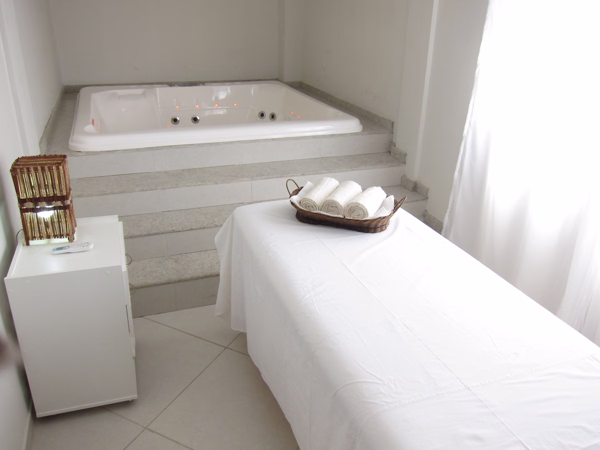 Suíte localizada no andar térreo com vista para o mar, cama box king size de 1,80m x 2,00m e uma ante sala com sofá cama, banheiro, banheira de hidromassagem, ducha com aquecimento central, ar condicionado SPLIT, TV LED de 32″ com programação a cabo e canais abertos, frigobar, cofre, secador de cabelo, wifi e varanda com rede e cadeiras. Voltagem 110V.
