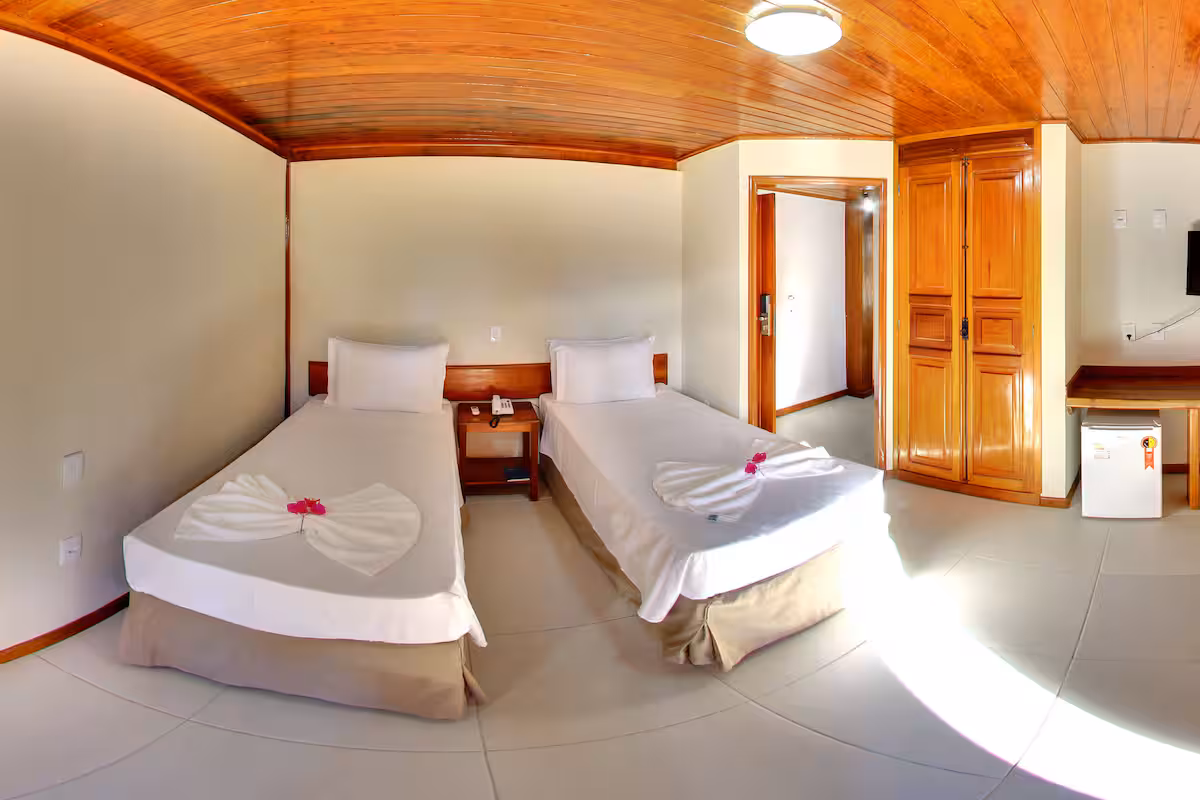 Apartamentos standard possui 2 cama box de solteiro (1,88m X 0,88m), ducha com aquecimento central, ar condicionado Split, TV a cabo 32″, frigobar, cofre, secador de cabelo, acesso à internet via Wi-Fi grátis, varanda com mesa, cadeiras e rede. Voltagem 110V.