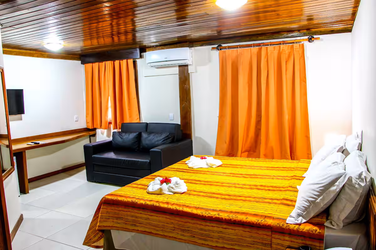 Apartamentos standard possui 1 cama king size 1,80m X 2,0m e 1 cama box de solteiro, ducha com aquecimento central, ar condicionado Split, TV a cabo 32″, frigobar, cofre, secador de cabelo, acesso à internet via Wi-Fi grátis, varanda com mesa, cadeiras e rede. Voltagem 110V.