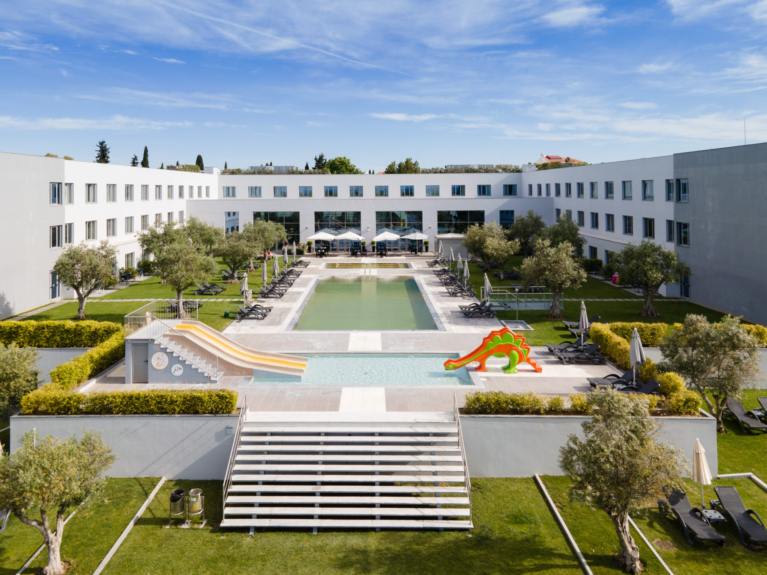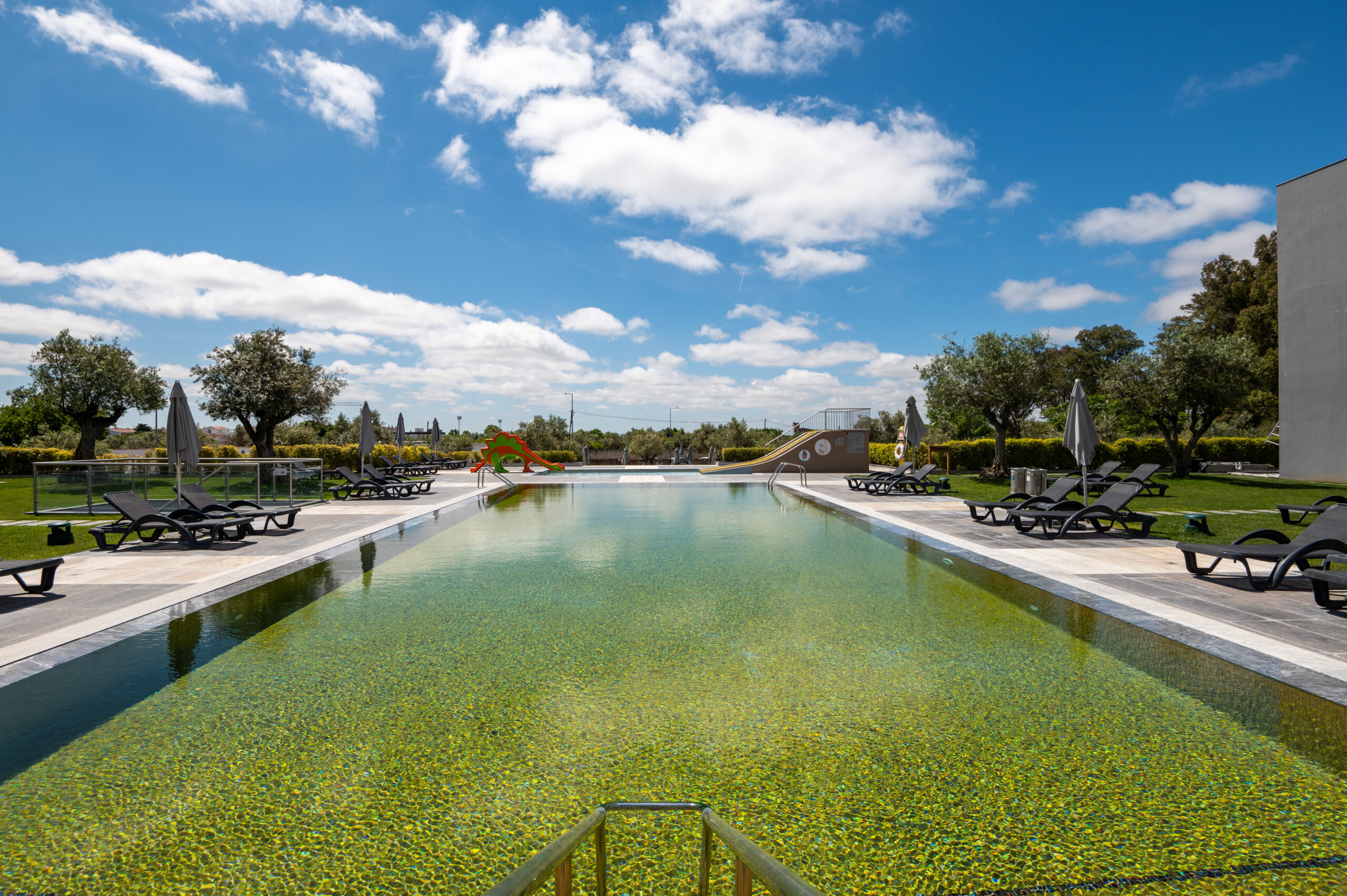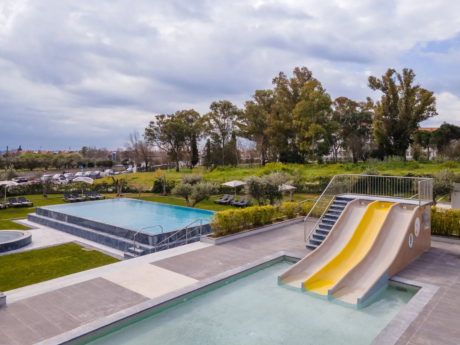 Na piscina exterior há zona para crianças e tobogãs, o que torna a experiência ainda mais animada para os pequenos hóspedes.