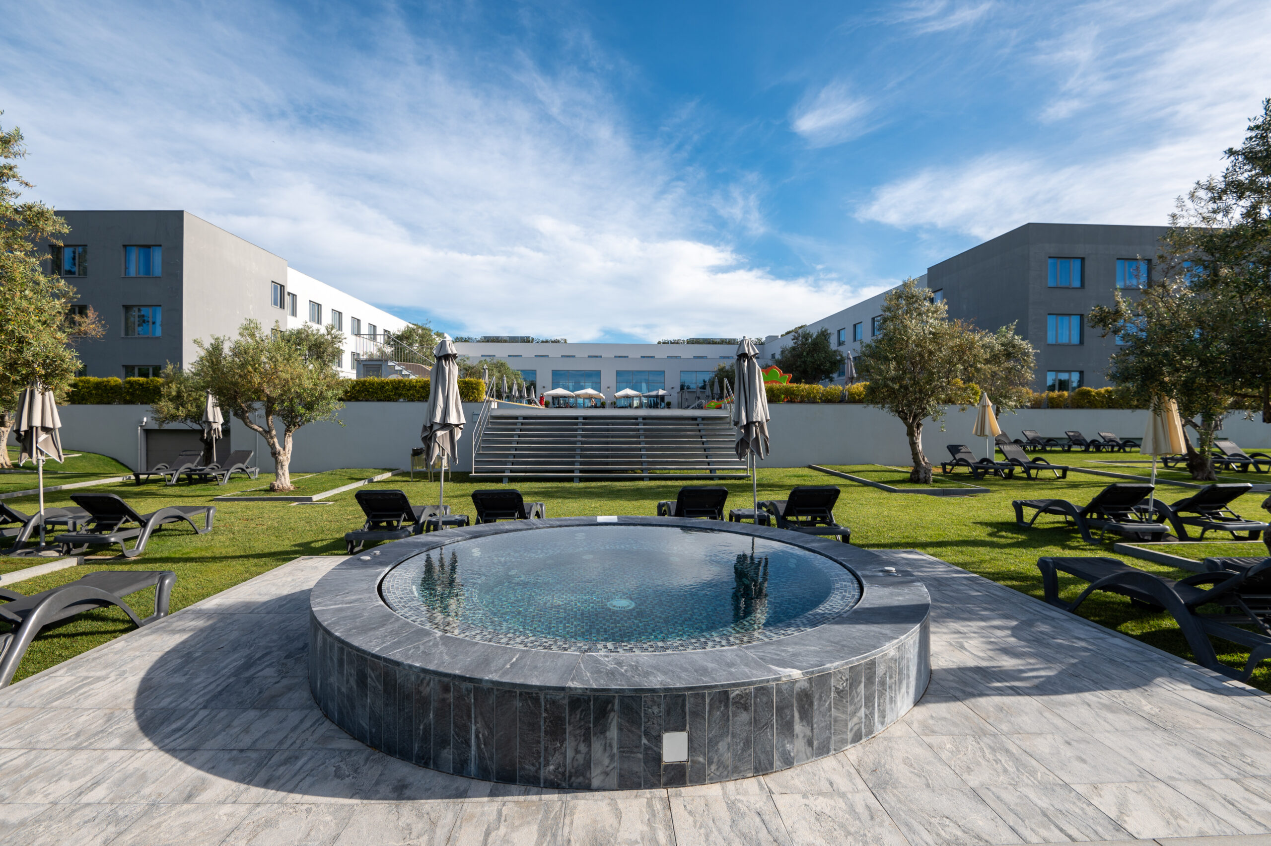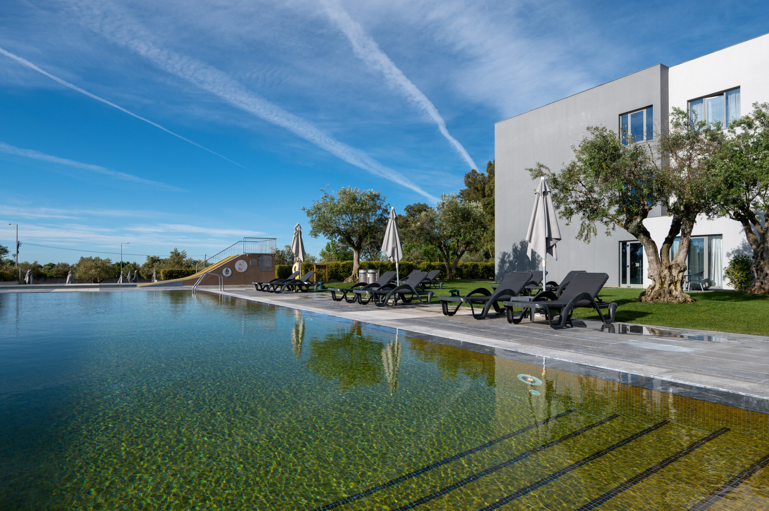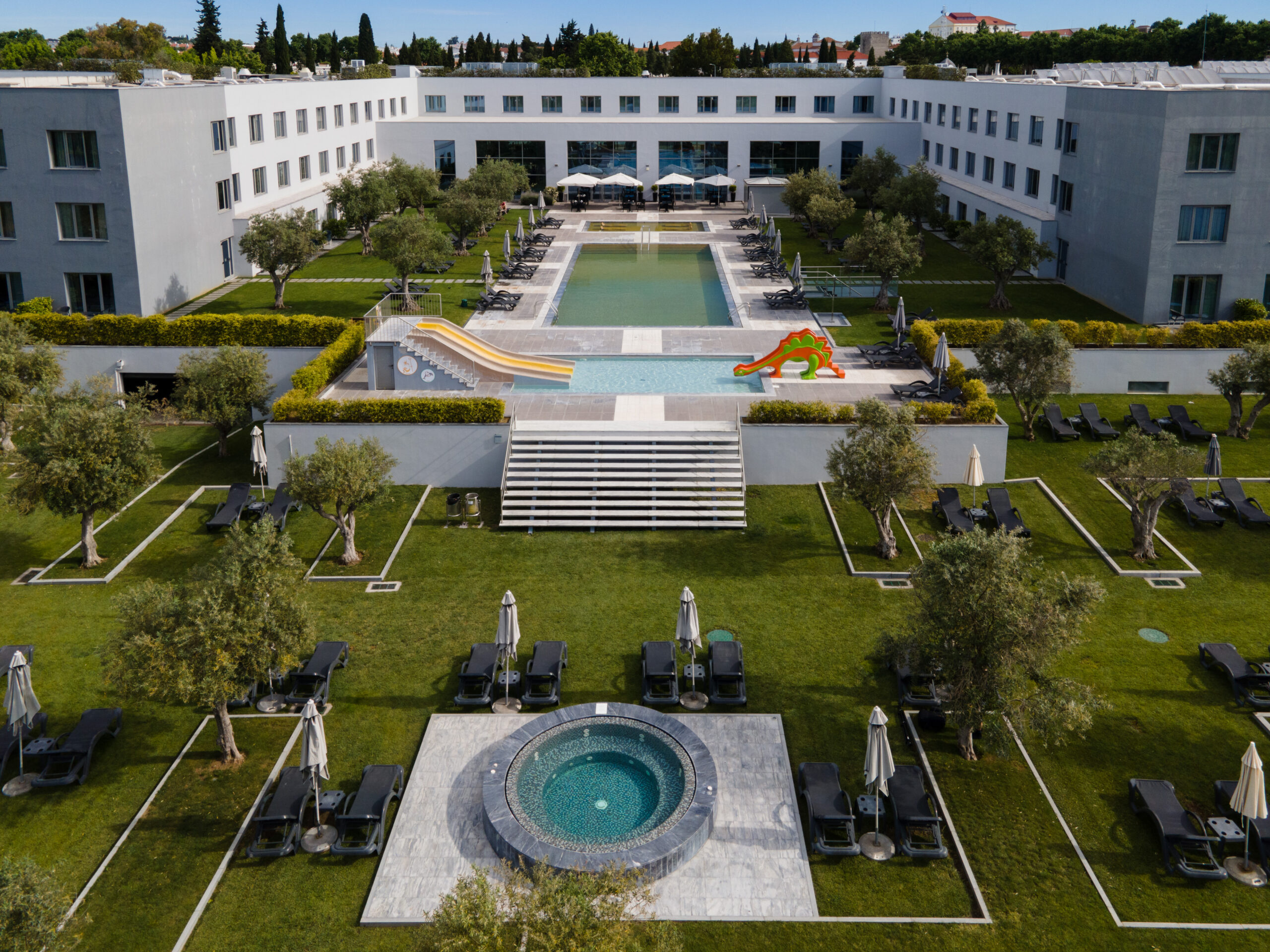 Na piscina exterior há zona para crianças e tobogãs, o que torna a experiência ainda mais animada para os pequenos hóspedes.