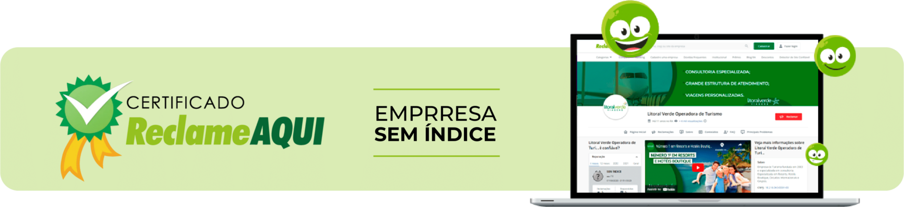 Um dos aspectos mais notáveis da Litoral Verde é o fato de não possuirmos um índice de reputação no ReclameAqui - o que é extremamente positivo, já que isso significa que não possuímos reclamações dos clientes o suficiente para sermos avaliados. Esta, na verdade, é a melhor reputação possível!